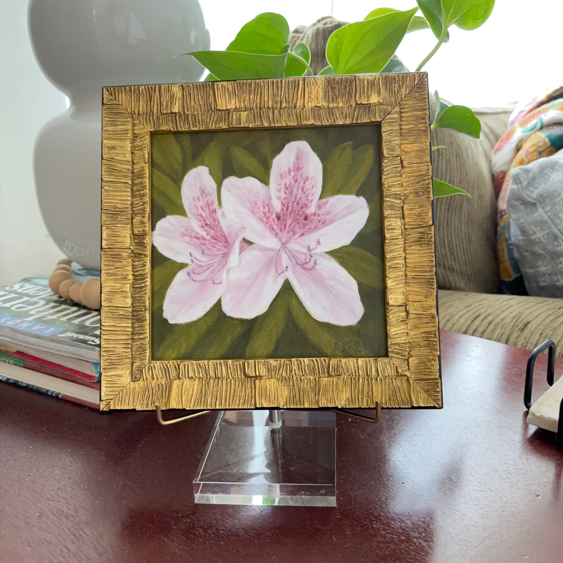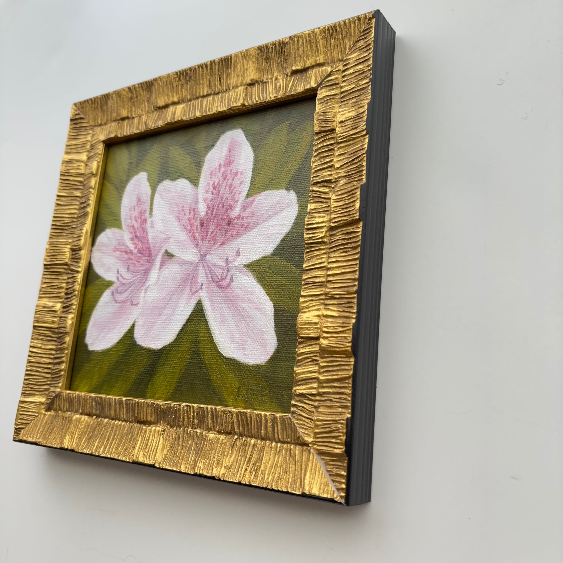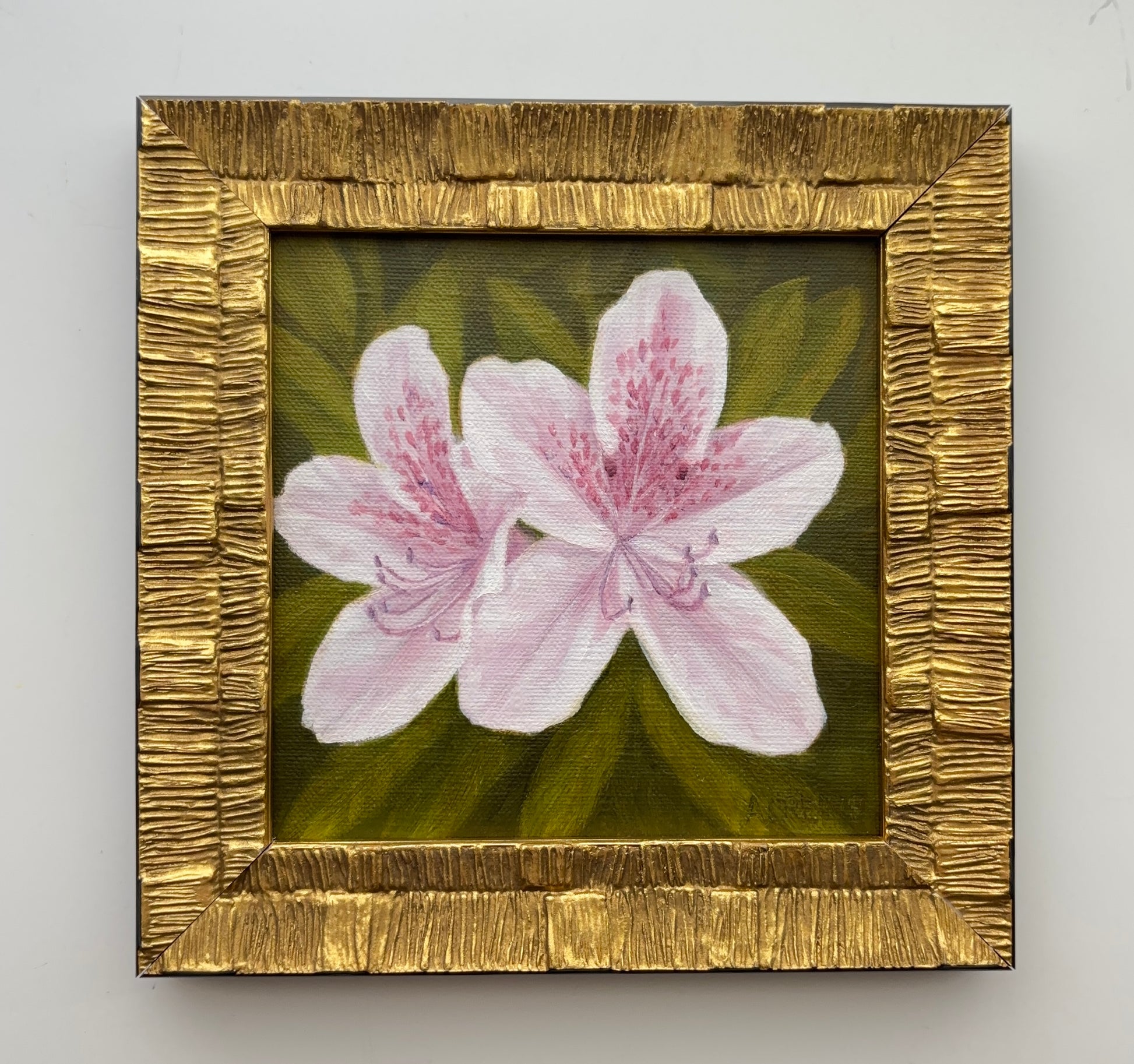 Azalea's remind me of Easter photos in the yard and The Masters. They remind us that spring has finally arrived. Oil painting measures 6" x 6" on linen panel. Framed. Shipping and insurance is included in the price. Please allow 1-2 weeks for delivery.