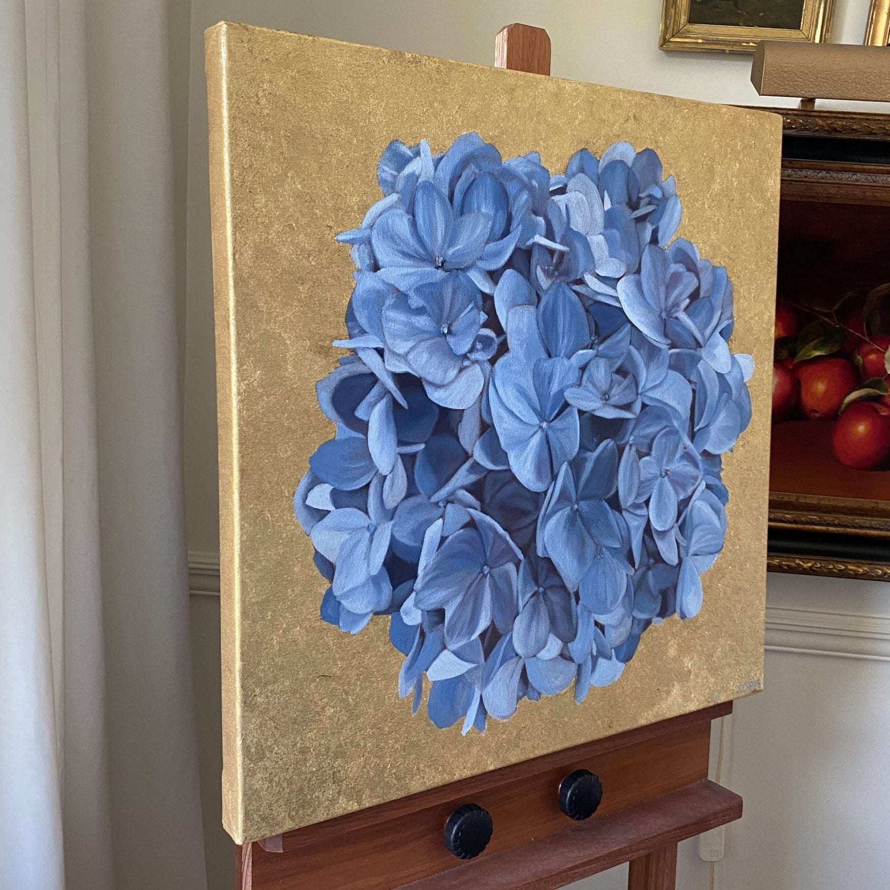 This painting is 24"x 24"x 1.5". Oil on canvas with gold leaf surround. Shipping and insurance is included in the price. Please allow 1-2 weeks for delivery.