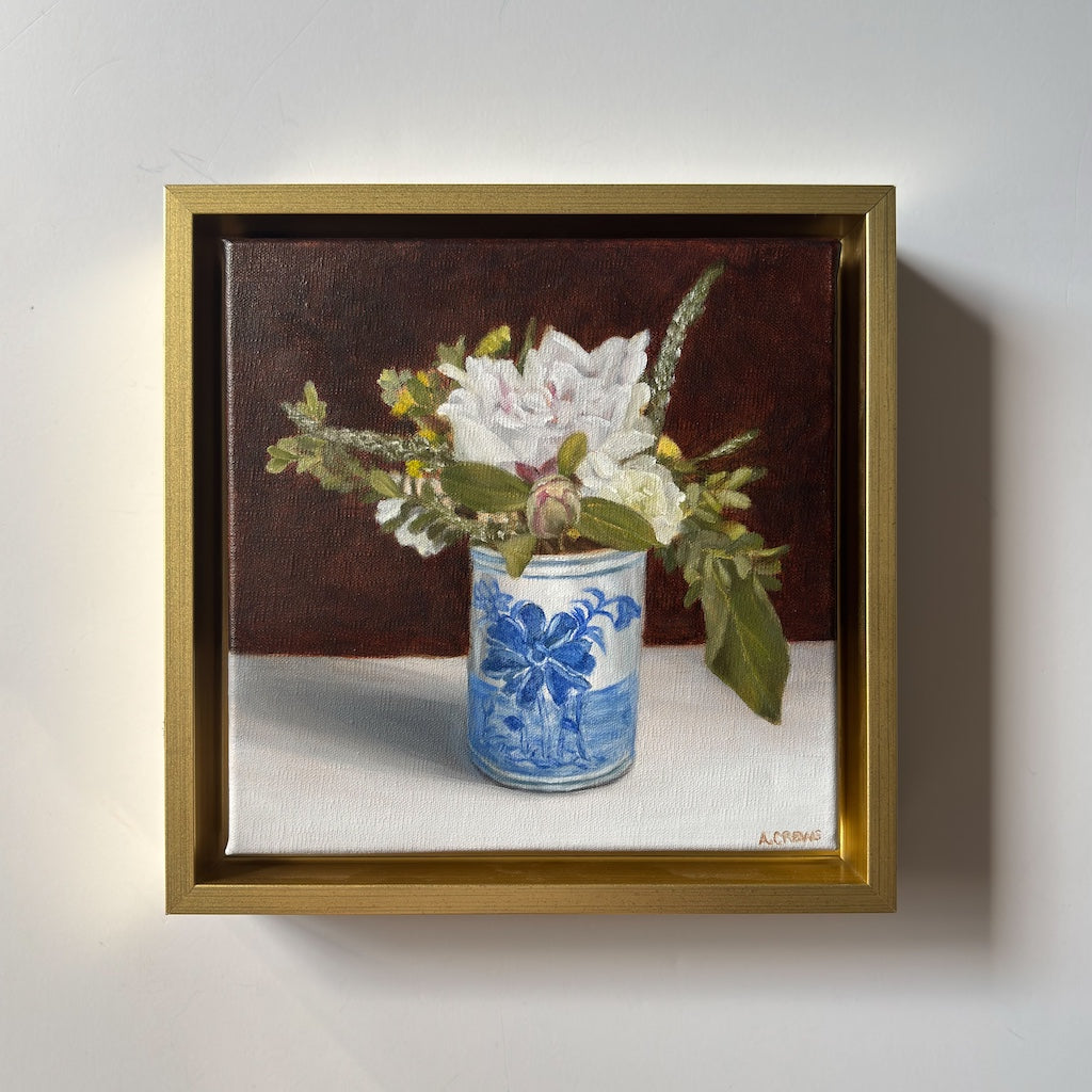 A charming gathering of blooms in a blue and white vessel. This painting measures 8" x 8" and comes framed to perfection in a gold floater frame . Oil on canvas. Shipping and insurance is included in the price. Please allow 1-2 weeks for delivery.