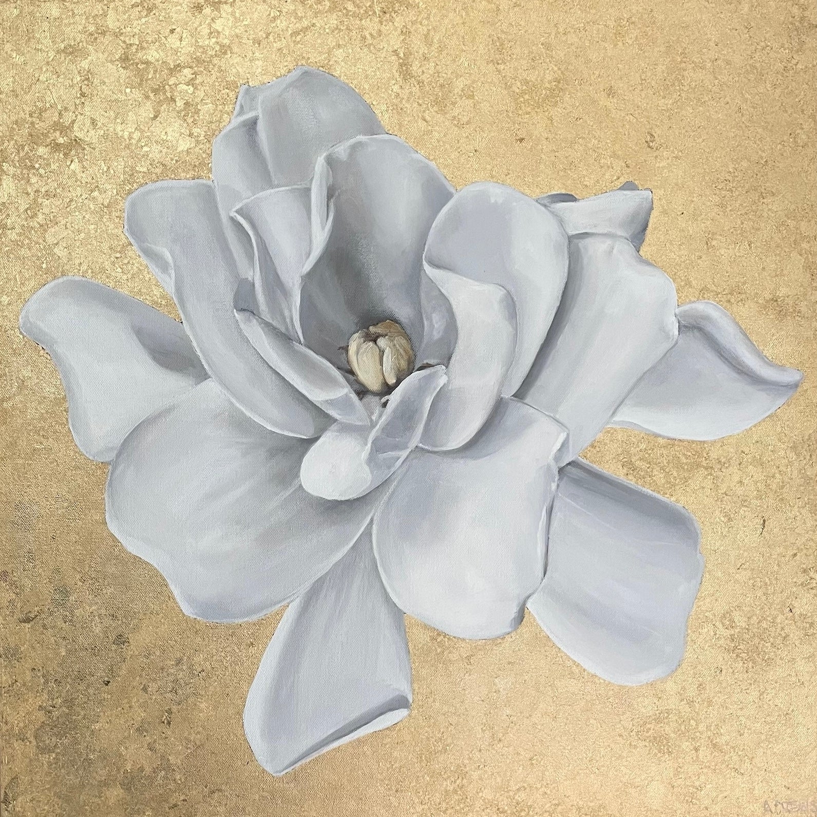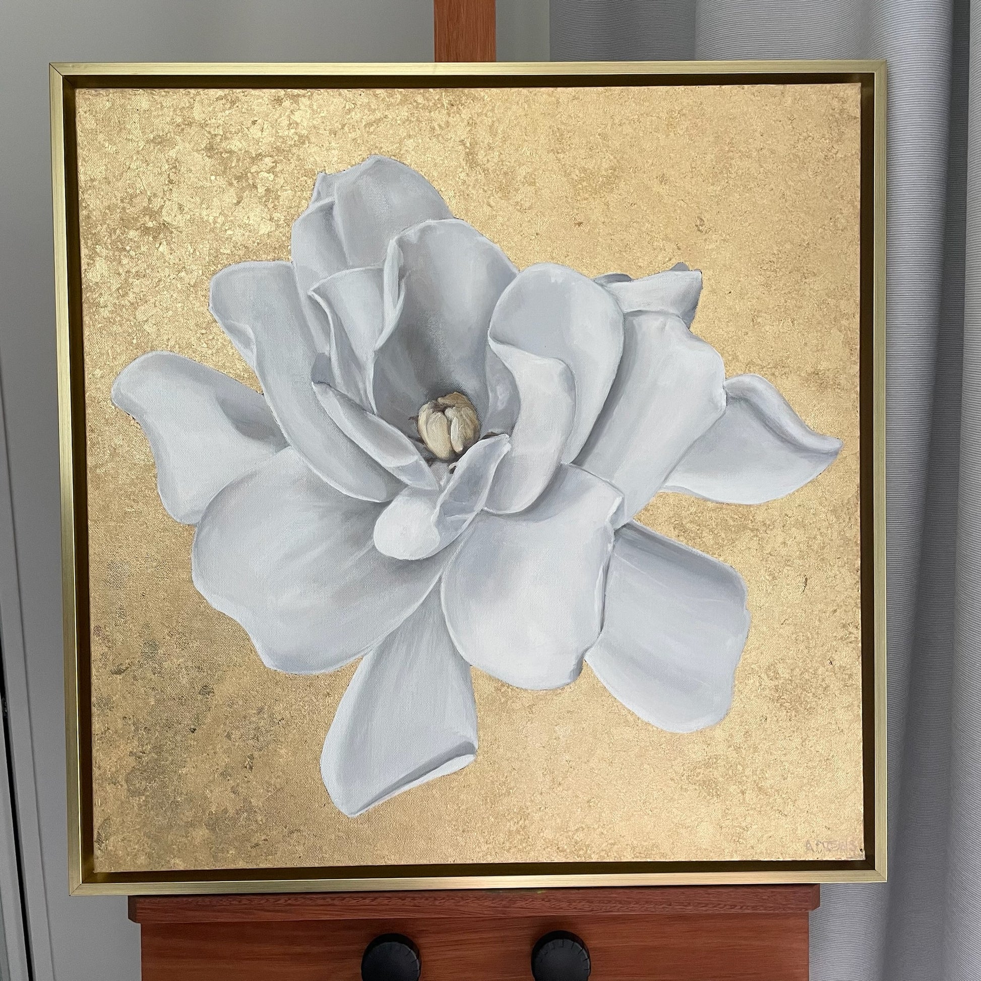 Gardenias are one of my favorite blooms. This one measures 24"x 24"x 1.5". Oil on canvas with gold leaf surround. Framed. Partners perfectly with "Gracious"...because goodness gracious go together of course.