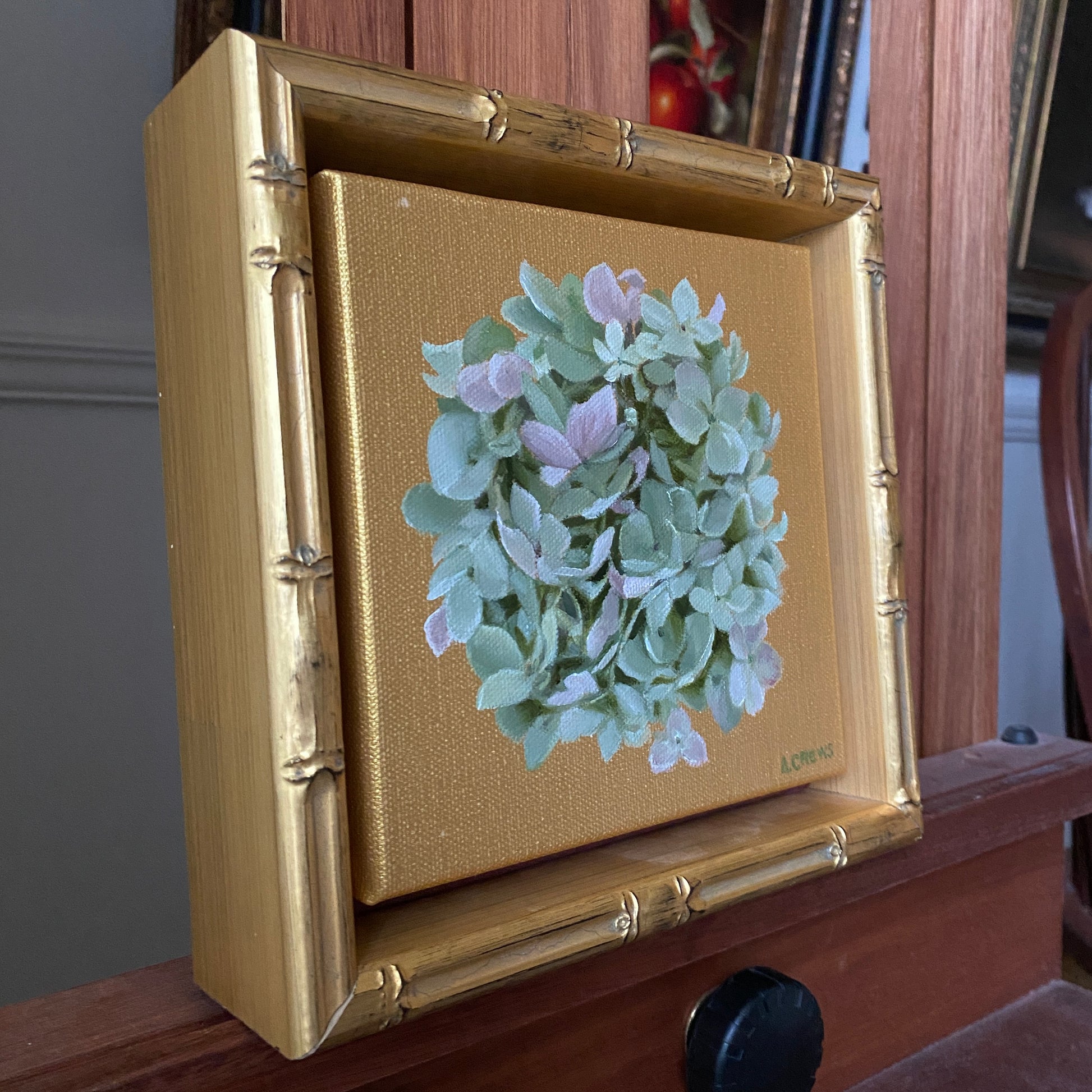 Original hydrangea oil painting on gold canvas measures 6"x6" and looks stunning her her bamboo frame. Shipping and insurance is included in the price. Please allow 1-2 weeks for delivery.