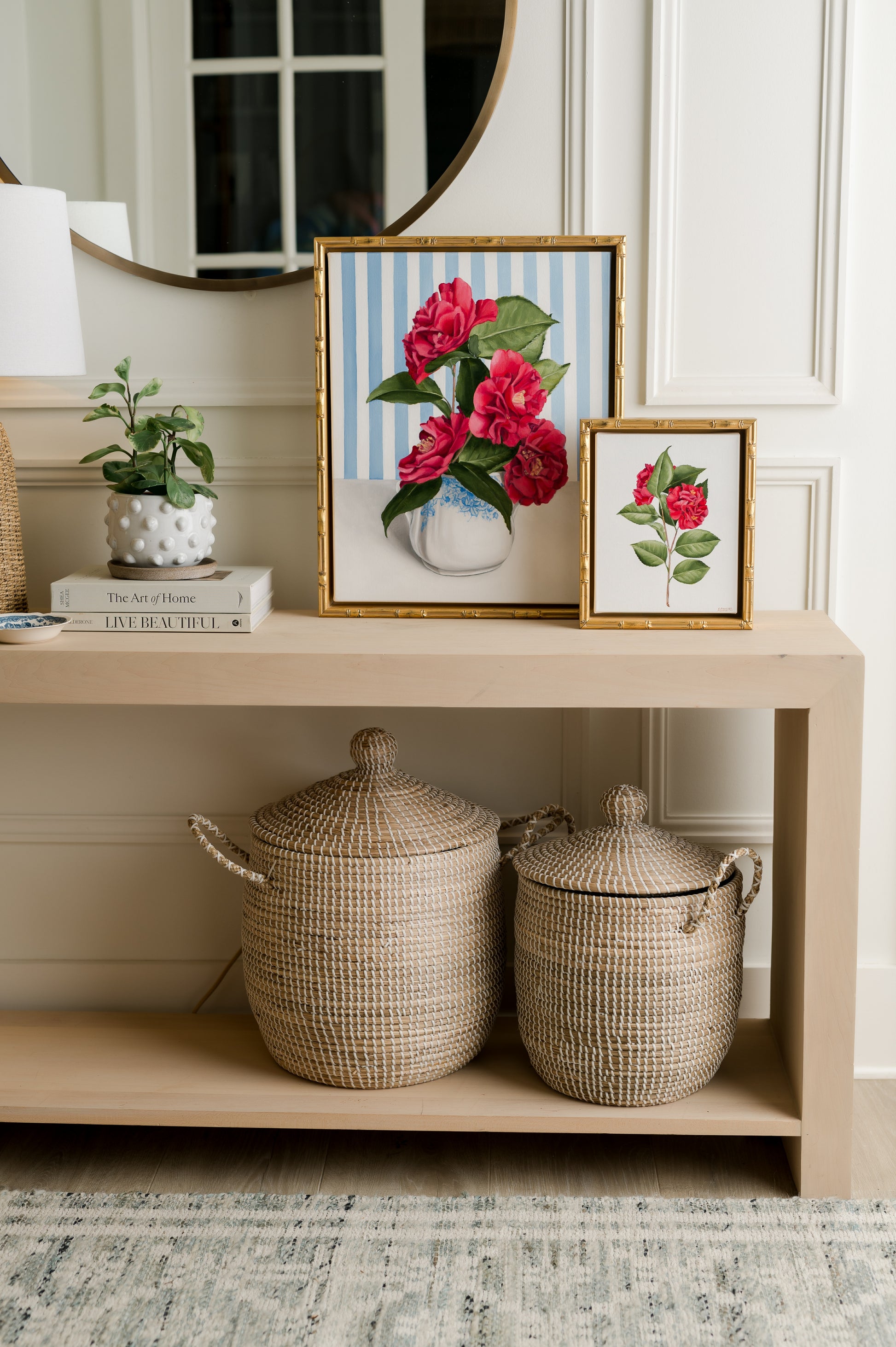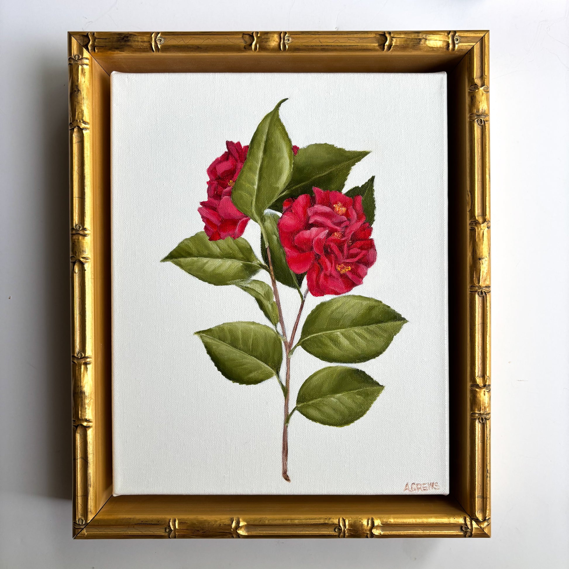 A perfect camellia stem fresh from the garden. Oil painting measures 8"x10"x1.5". Framed in a beautiful gold bamboo floater frame. (With frame, measures 10"x12") ©Amy Crews Artist All Rights Reserved. Shipping and insurance is included in the price. Please allow 1-2 weeks for delivery.