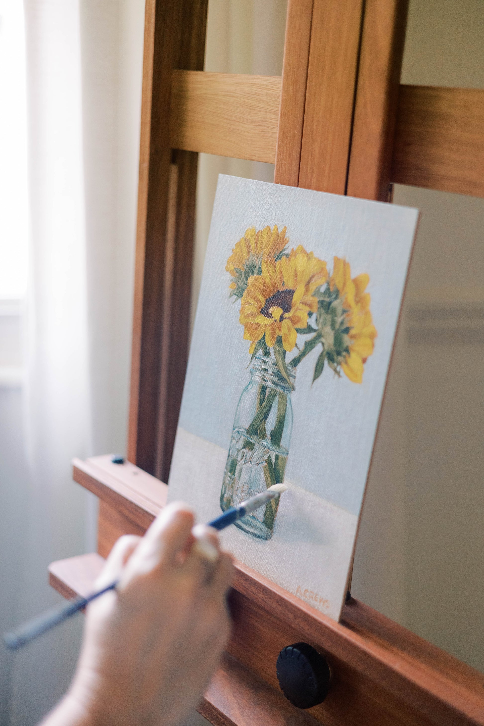 As soon as I finished this painting I knew it was a keeper and belonged to our daughter. Sunflowers are her favorite and mason jars are the way she shares flowers with friends. Unframed. Printed and signed upon order. Please allow 1-2 weeks for delivery.