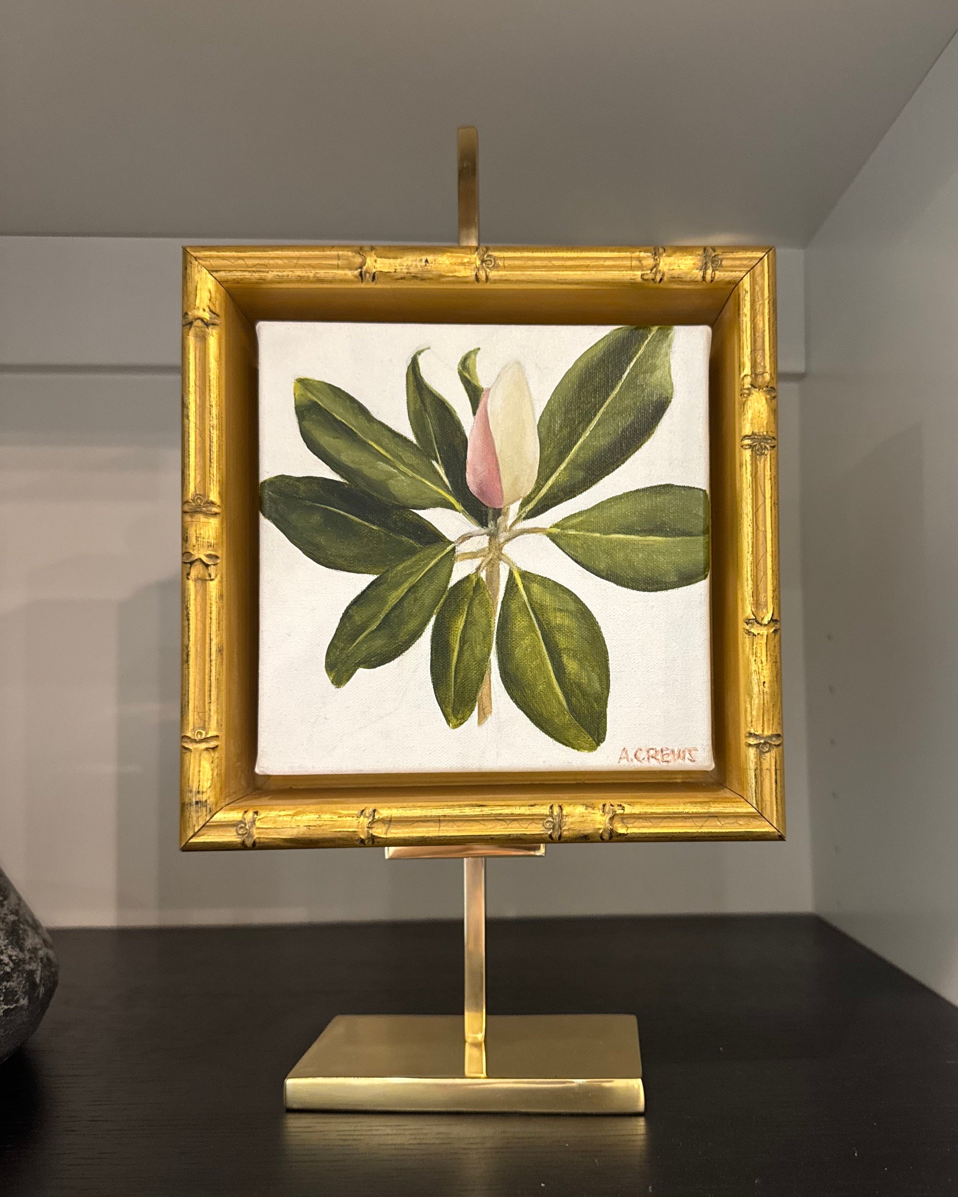 A young magnolia full of promise. This piece is currently on display as part of the 2025 Parade of Homes in Brentwood, TN. Oil painting measures 6"x6"x1.5". Framed in a beautiful gold bamboo floater frame. (With frame, measures 8"x8") Easel is not included. ©Amy Crews Artist All Rights Reserved.