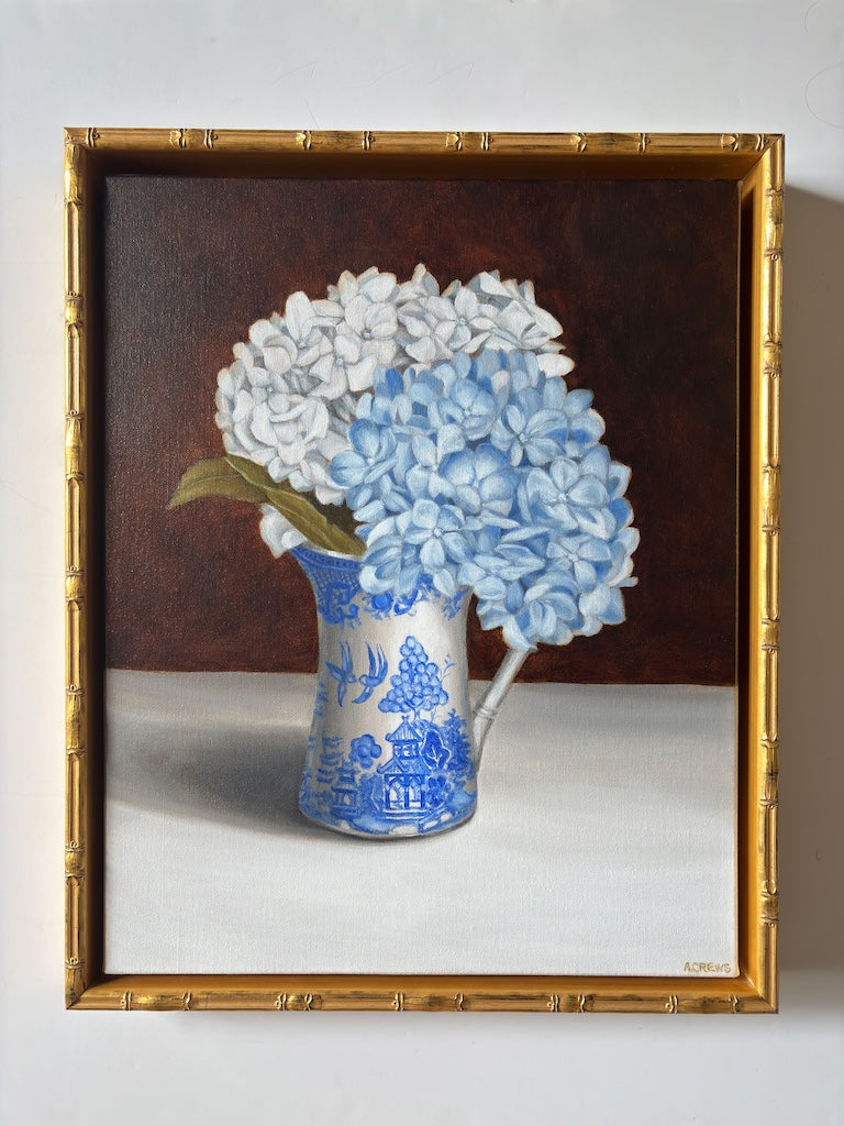 A charming pair of hydrangeas in a blue and white pitcher. This oil painting measures 16" x 20" and comes framed in a gold bamboo floater frame. Shipping and insurance is included in the price. Please allow 1-2 weeks for delivery.