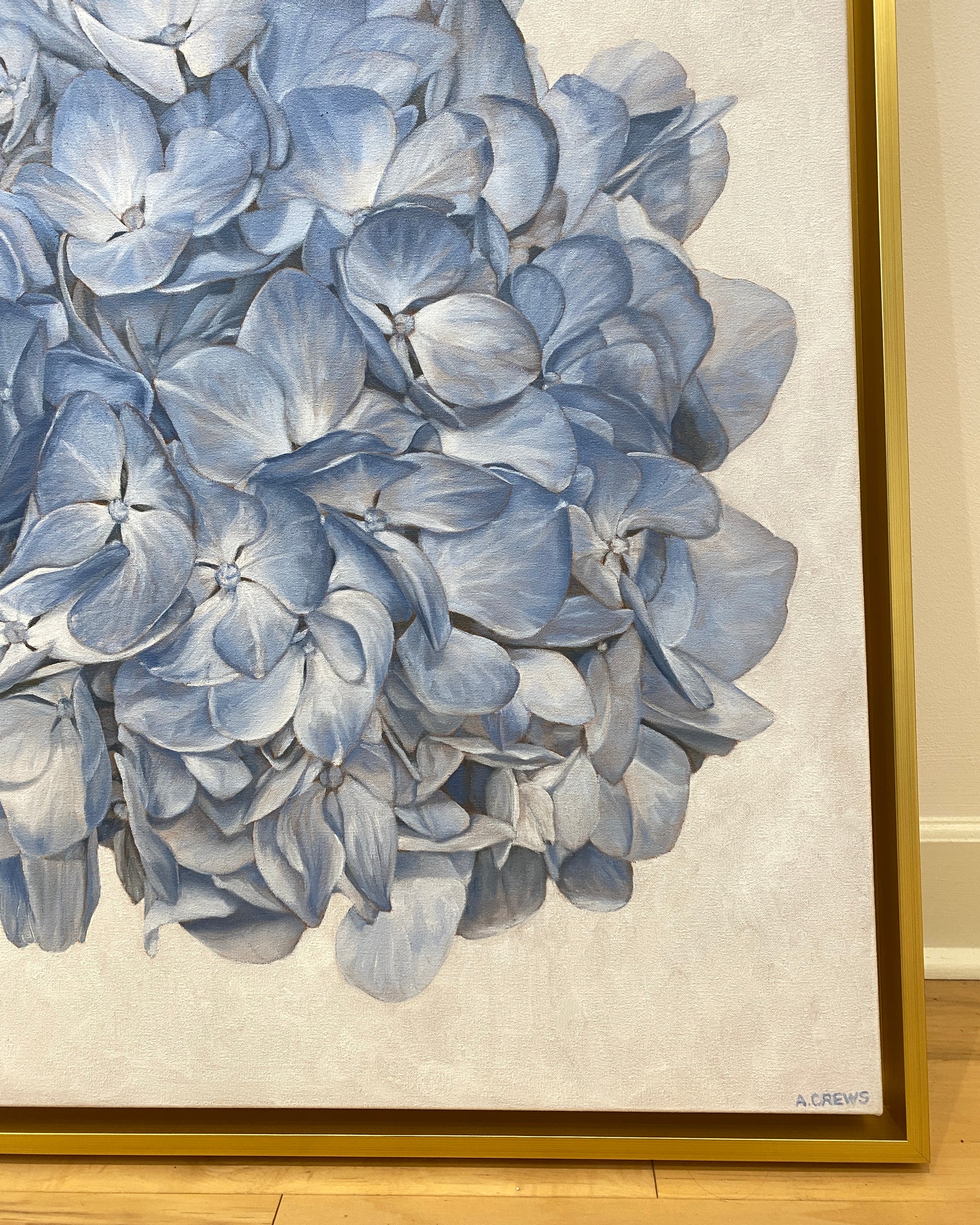 As seen in Serena & Lily. It's easy to lose yourself in the softness of this blue hydrangea. Each small bloom is a detailed flower in itself. This painting measures 36"x36"x1.5". Oil on canvas. Framed. Shipping and insurance is included in the price. Please allow 1-2 weeks for delivery.