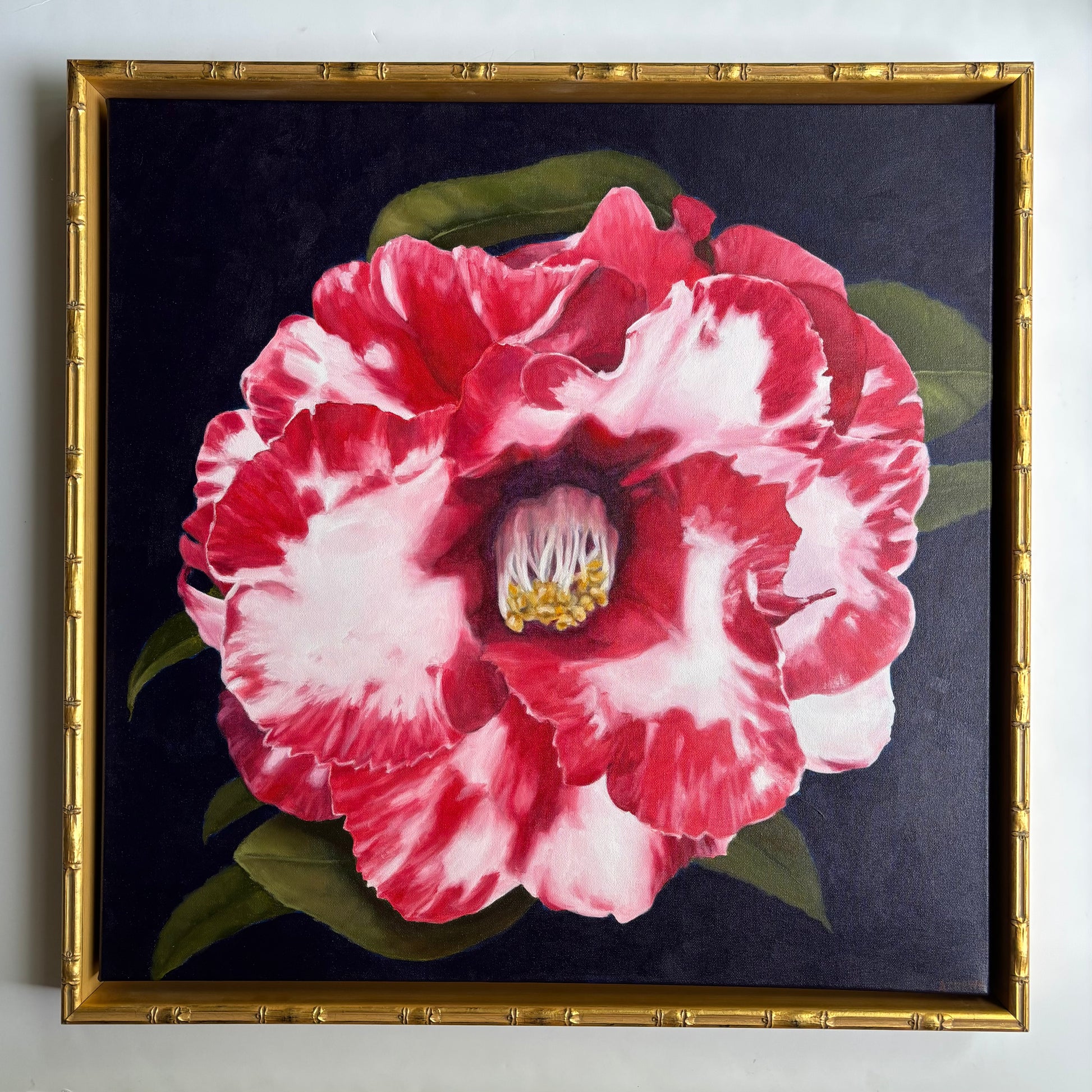 This camellia flower looks stunning on a navy blue background. A perfect companion for "Swoon". Oil painting measures 24"x24"x1.5". Framed in a beautiful gold bamboo floater frame. (With frame, measures 26"x26") ©Amy Crews Artist All Rights Reserved. Shipping and insurance is included in the price. Please allow 1-2 weeks for delivery.