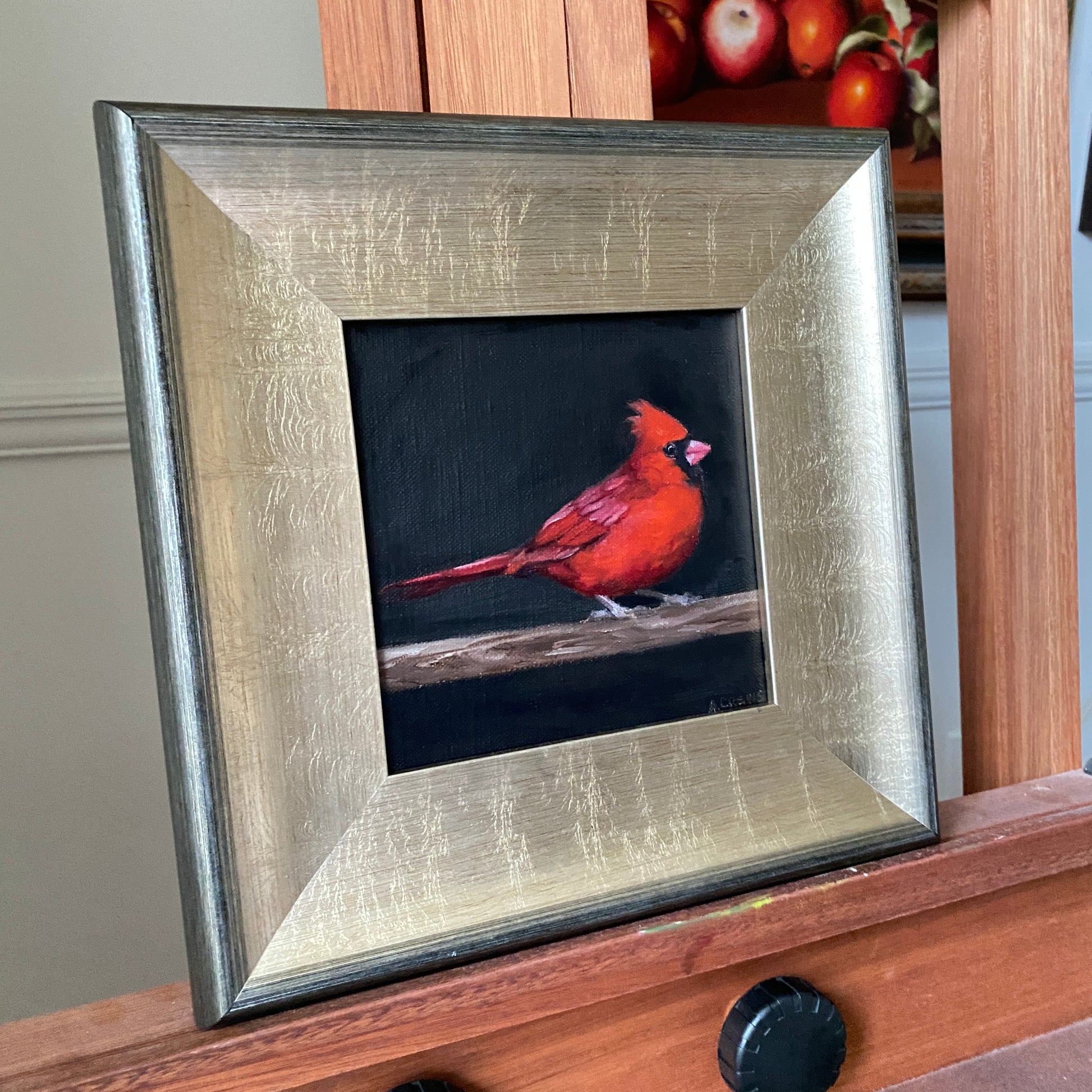 A beautiful cardinal sits atop a branch to say hello. Original oil painting measures 6"x6" on linen panel. Shipping and insurance is included in the price. Please allow 1-2 weeks for delivery.Price includes frame.