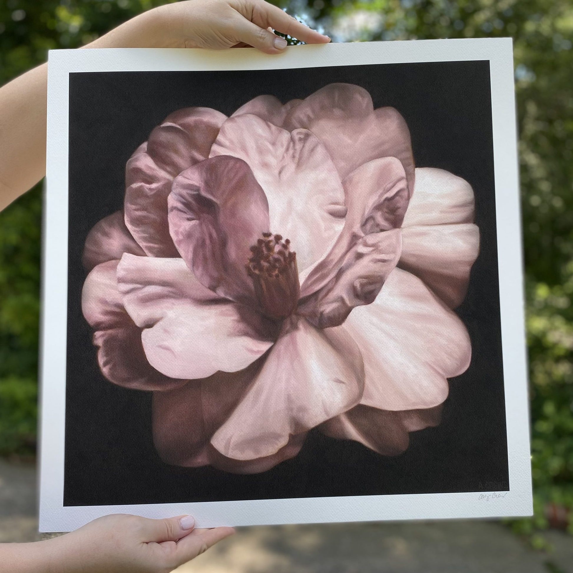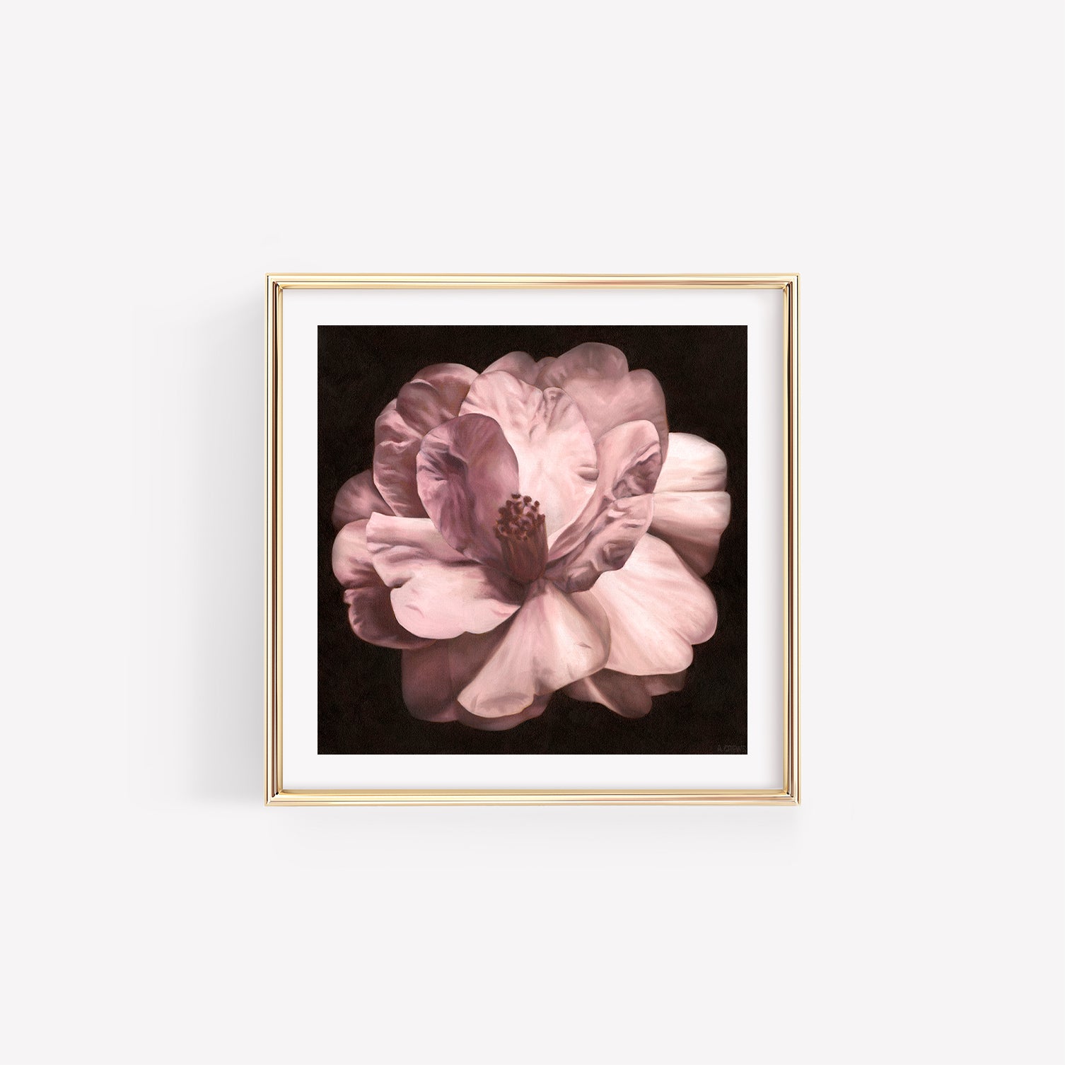 It was the last bloom in my mother’s garden. I have painted it many times over the years, but this dramatic pink camellia color may be my favorite yet! I’ve titled my paintings of this special bloom “Vespers” in memory of my mom. (There is a story behind that name here on my blog.) Be sure to see the companion piece as well. Vespers 1 & 2 make a beautiful set together. Looking for a custom size? Contact me to see whats possible. Printed and signed upon order. Please allow 1-2 weeks for delivery.